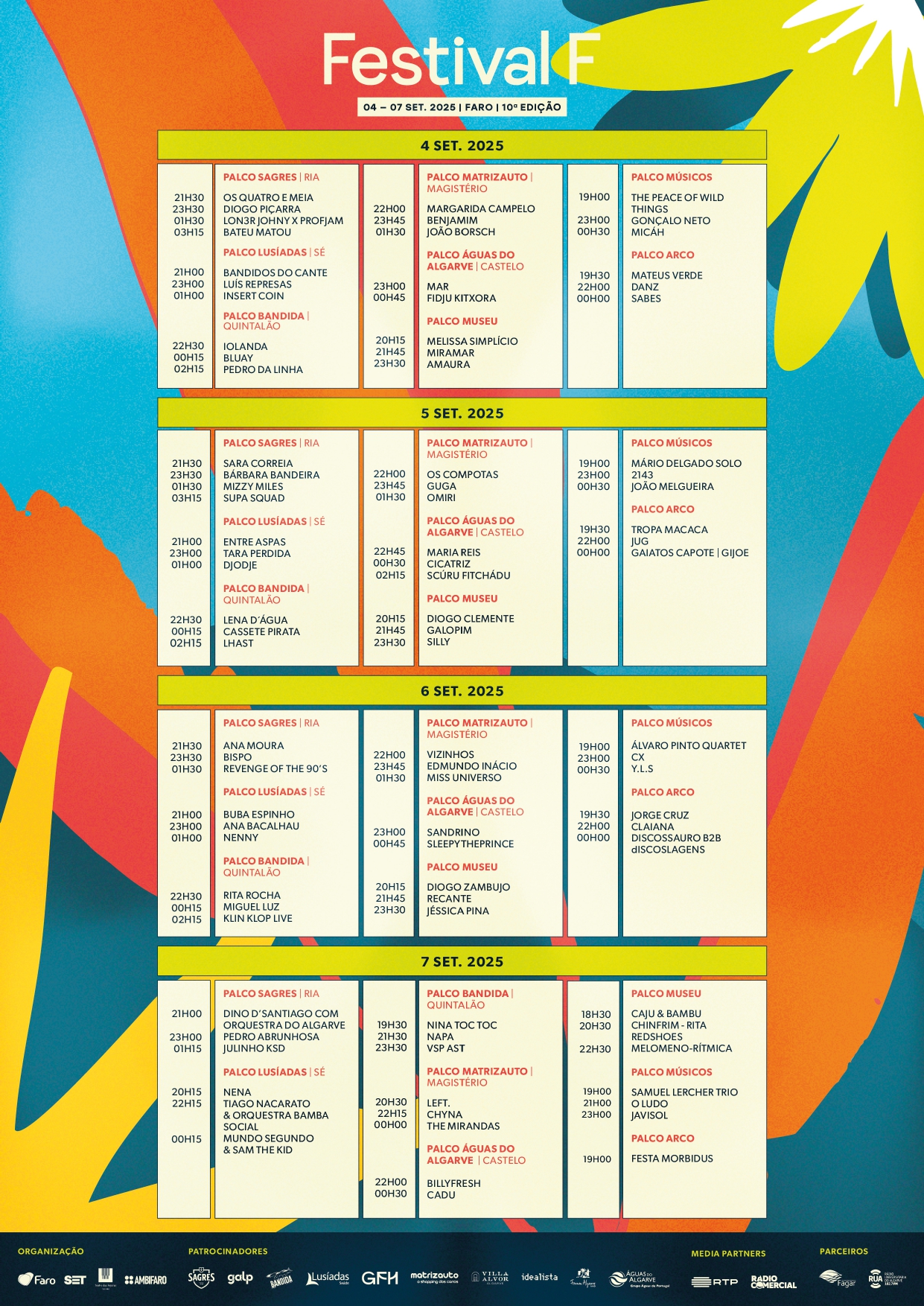 A 10.ª edição conta com o apoio dos principais patrocinadores: Sagres, Bandida, Galp, Lusíadas, Matrizauto, Villa Alvor, Idealista e Forum Algarve, e dos media partners oficiais RTP e Rádio Comercial, cujo contributo é essencial para consolidar o Festival F como uma plataforma de promoção da música e da cultura portuguesas.