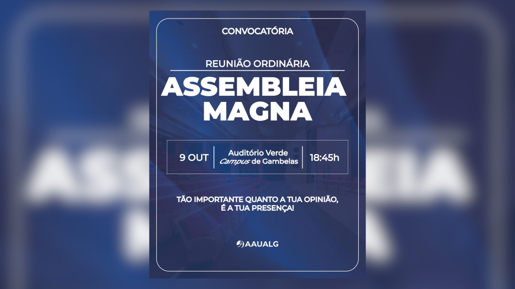 A Mesa da Assembleia Magna da Universidade do Algarve convida toda a comunidade académica para participar na Reunião Ordinária da Assembleia Magna agendada para esta tarde. Vai acontecer às 18h45 da tarde no Auditório Verde do Campus de Gambelas da UAlg. A primeira chamada será às 18h45 e, caso não se verifique quórum, será feita […]